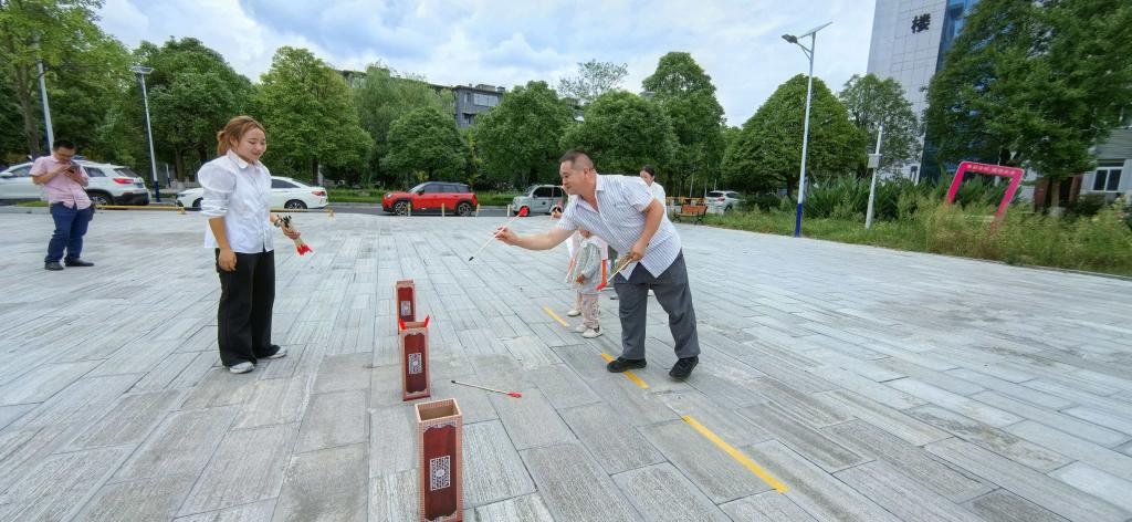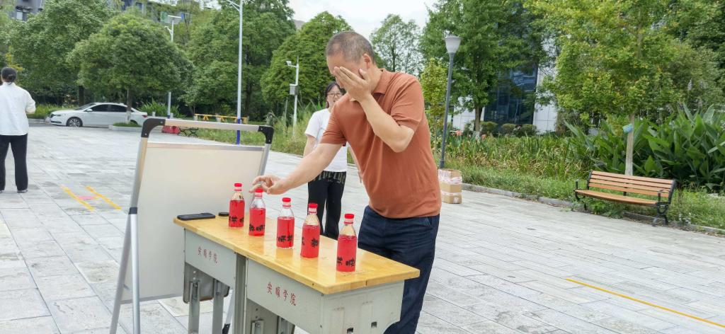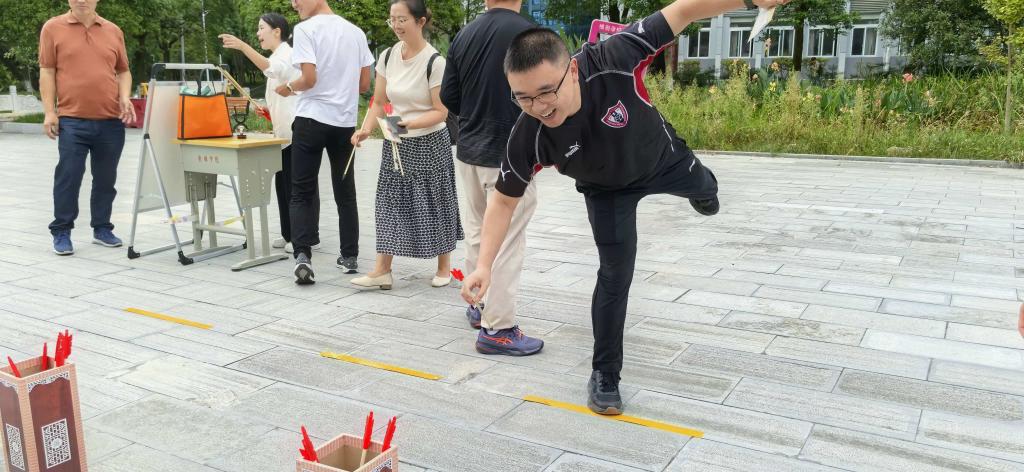 本次活动由校工会精心设计了集趣味性和协作性于一体的活动项目,包括趣味投壶、蒙眼踏步、挤情运球、单手弹瓶盖