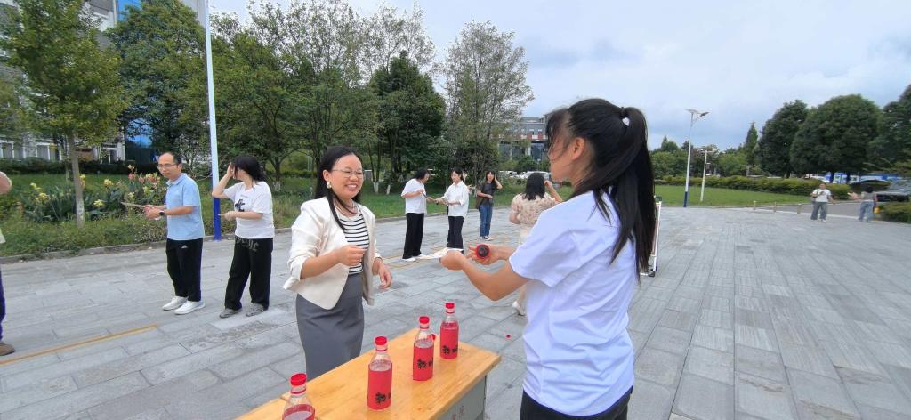 等趣味项目。教职工们默契配合、互帮互助。运动场上,欢笑声此起彼伏。大家在趣味活动中收获了快乐,增进了彼此之间的友谊,整个校园都沉浸在一片欢乐祥和的氛围之中。活动结束时老师们凭完成全部项目的盖章打卡券领取了教师节纪念品。
