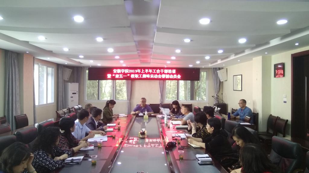 4月22日下午,安顺学院2019年上半年工会干部培训暨“迎五一”教职工趣味运动会赛前动员会在行政楼二楼会议室召开,安顺学院副校长令狐荣涛,各分工会主席和工会全体成员参加会议。