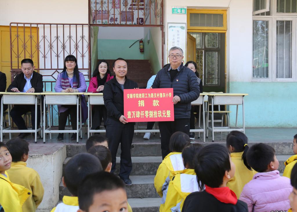 安顺学院副校长令狐荣涛(右)代表学校向路支村小学捐赠教职工捐款14089元