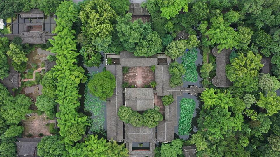 俯瞰三苏祠,树木葱茏。(总台记者齐涛拍摄)